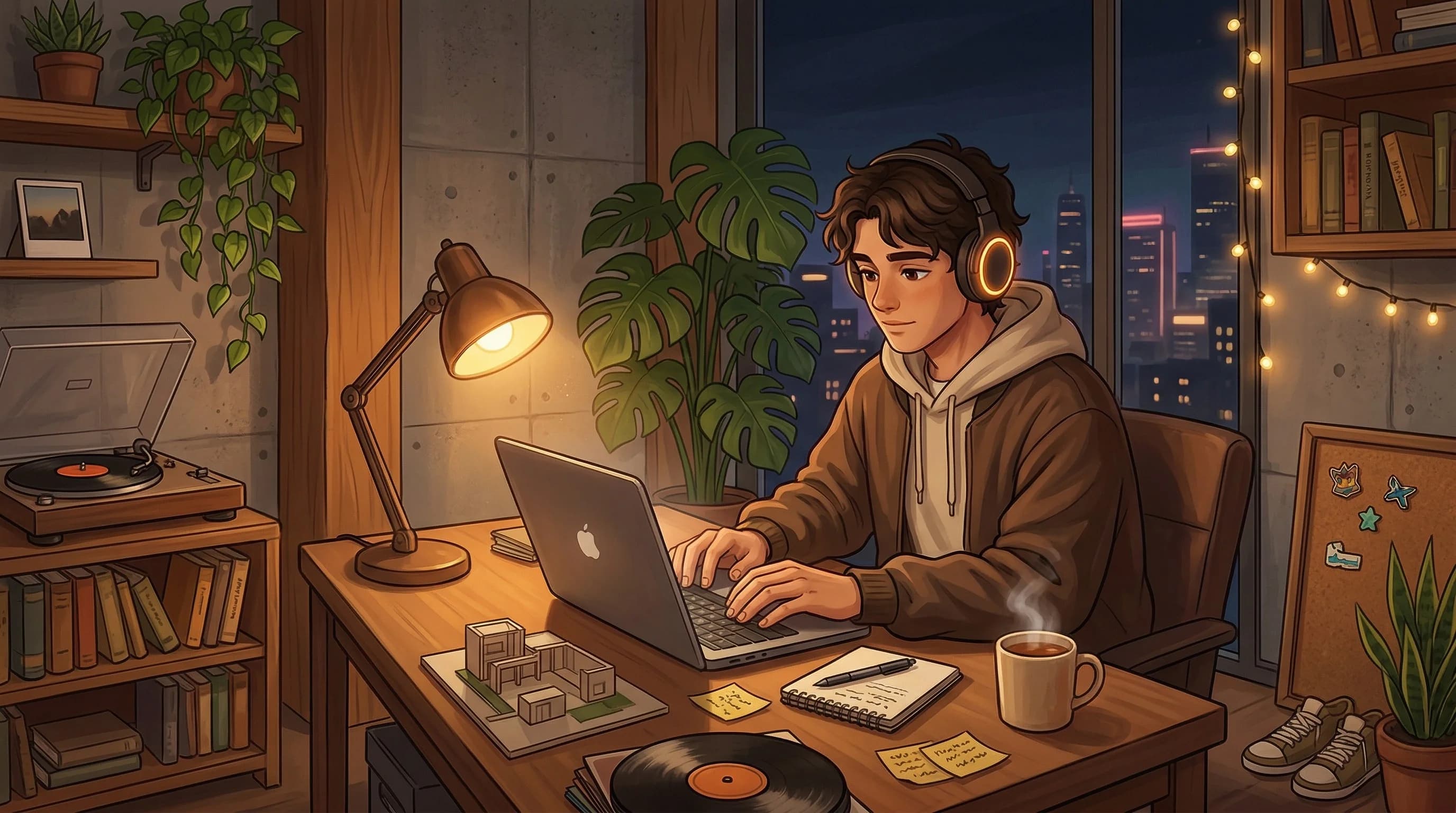 A cosmopolitan loft somewhere between cities. Warm wood, vinyl spinning, rain on the window. Your focus sanctuary — open 24/7.